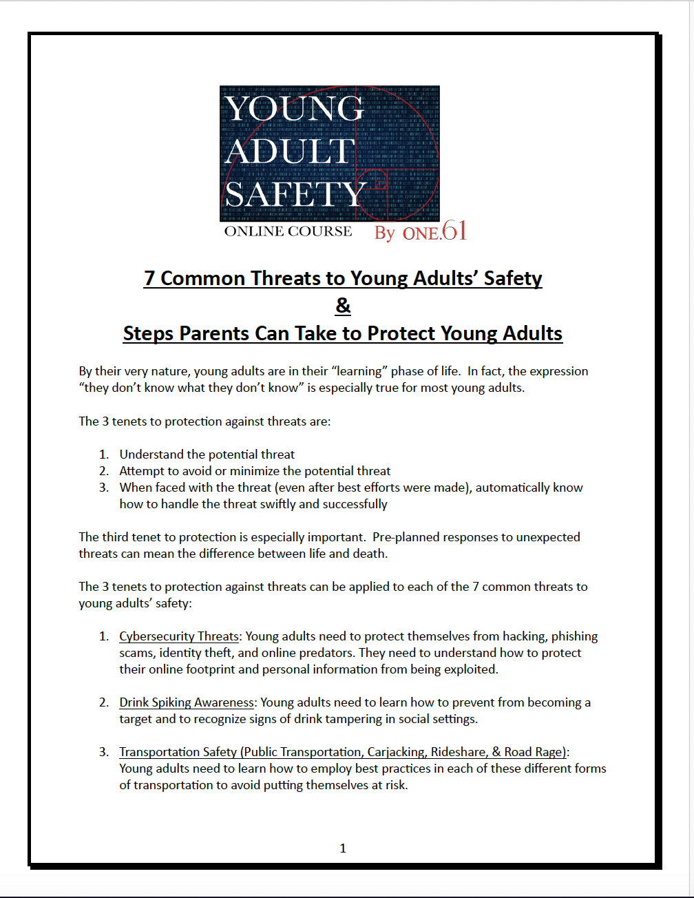 In this digital download, you will learn the 3 tenets to avoid becoming a victim, the 7 common threats to young adults' safety, and how to educate young adults with respect to these threats.